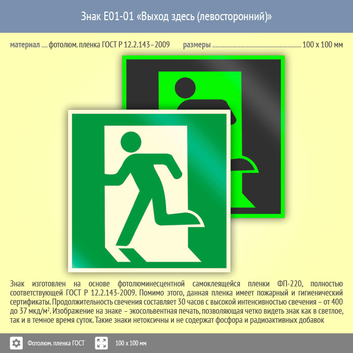 Знак E01-01 «Выход здесь (левосторонний)» (фотолюминесцентная пленка ГОСТ 34428-2018, 100х100 мм) в Яхроме купить