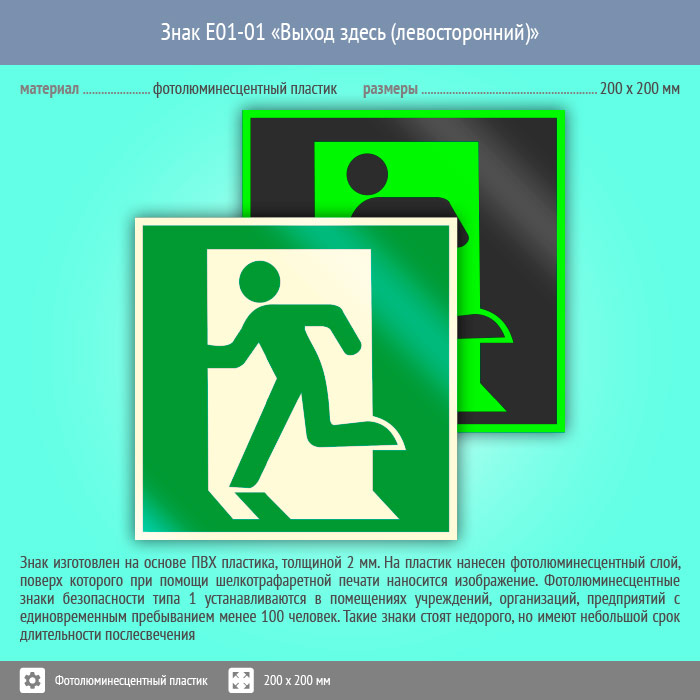 Знак E01-01 «Выход здесь (левосторонний)» (фотолюминесцентный пластик, 200х200 мм) в Яхроме купить