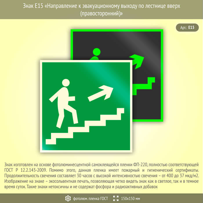 Знак E15 «Направление к эвакуационному выходу по лестнице вверх (правосторонний)» (фотолюминесцентная пленка ГОСТ 34428-2018, 150х150 мм) в Яхроме купить