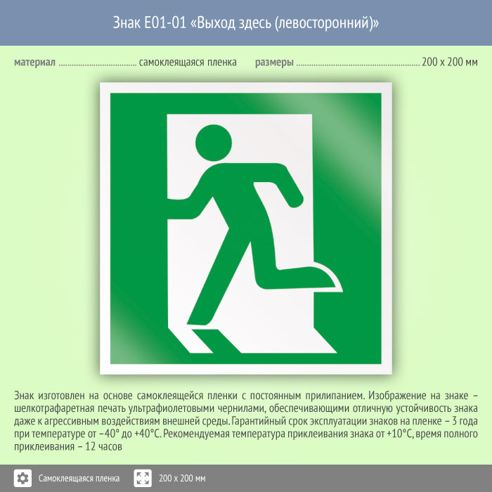Знак E01-01 «Выход здесь (левосторонний)» (пленка, 200х200 мм) в Яхроме купить