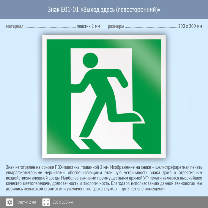 Знак E01-01 «Выход здесь (левосторонний)» (пластик, 200х200 мм) в Яхроме купить