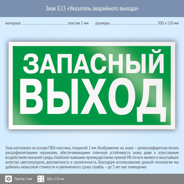 Знак E23 «Указатель запасного выхода» (устаревший) (пластик, 300х150 мм) в Яхроме купить