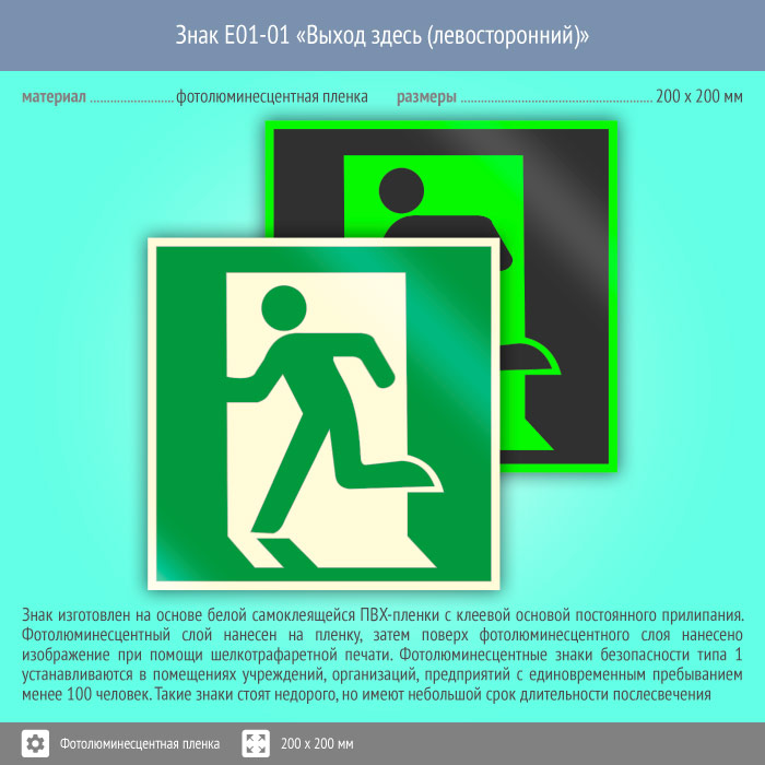Знак E01-01 «Выход здесь (левосторонний)» (фотолюминесцентная пленка, 200х200 мм) в Яхроме купить