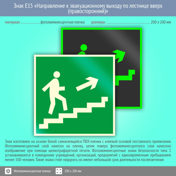 Знак E15 «Направление к эвакуационному выходу по лестнице вверх (правосторонний)» (фотолюминесцентная пленка, 200х200 мм) в Яхроме купить