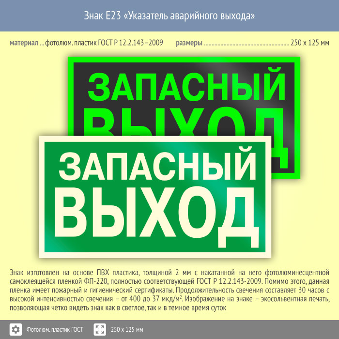 Знак E23 «Указатель запасного выхода» (устаревший) (фотолюминесцентный пластик ГОСТ 34428-2018, 250х125 мм) в Яхроме купить