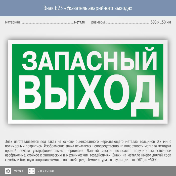 Знак E23 «Указатель запасного выхода» (устаревший) (металл, 300х150 мм) в Яхроме купить