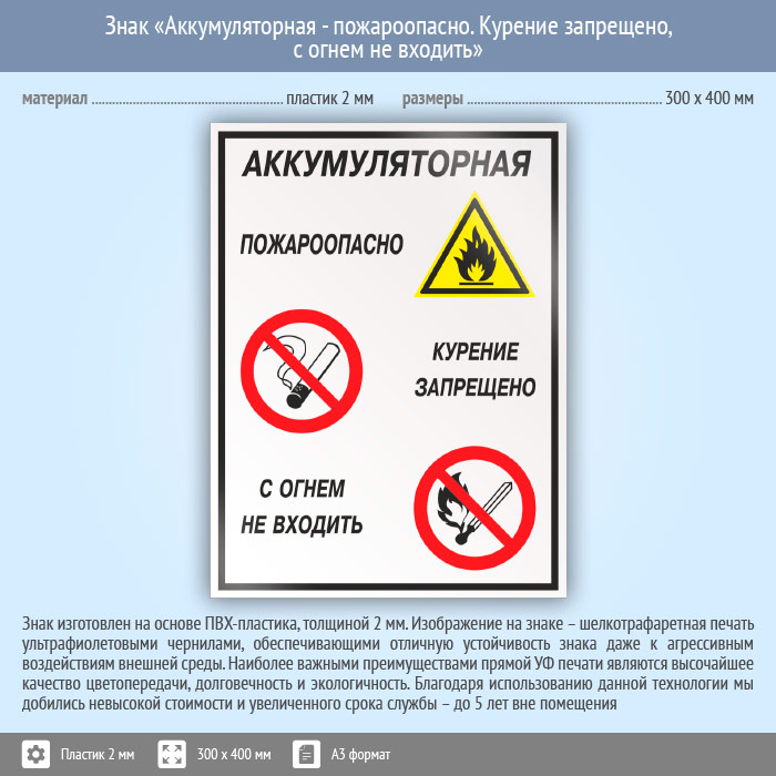 Знак «Аккумуляторная - пожароопасно. Курение запрещено, с огнем не входить», КЗ-01 (пластик, 300х400 мм) в Яхроме купить