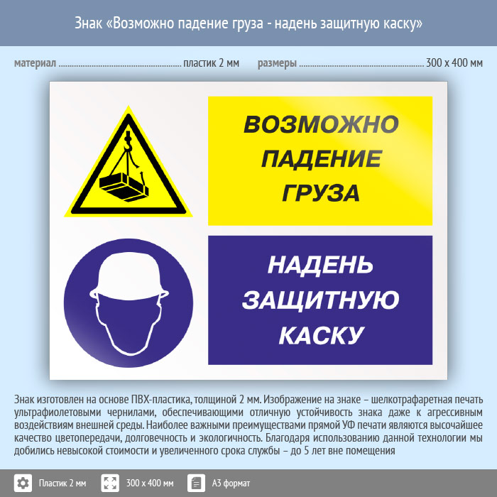 Знак «Возможно падение груза - надень защитную каску», КЗ-17 (пластик, 400х300 мм) в Яхроме купить