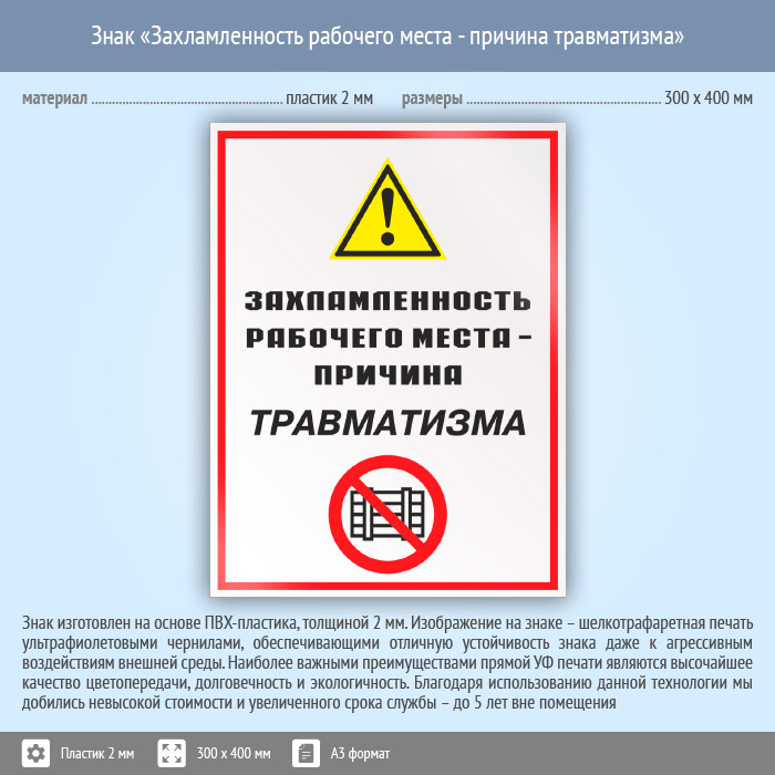 Знак «Захламленность рабочего места - причина травматизма», КЗ-21 (пластик, 300х400 мм) в Яхроме купить