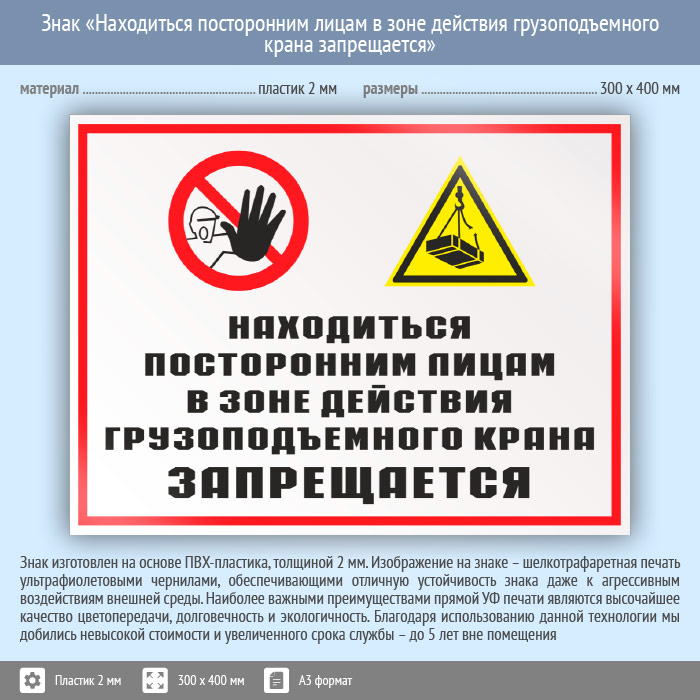 Знак «Находиться посторонним лицам в зоне действия грузоподъемного крана запрещается», КЗ-23 (пластик, 400х300 мм) в Яхроме купить