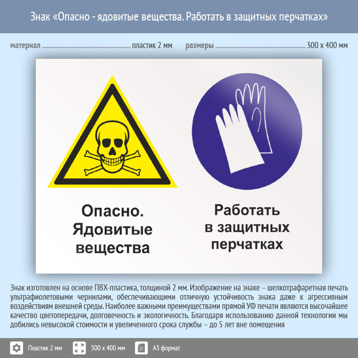 Знак «Опасно - ядовитые вещества. Работать в защитных перчатках», КЗ-43 (пластик, 400х300 мм) в Яхроме купить