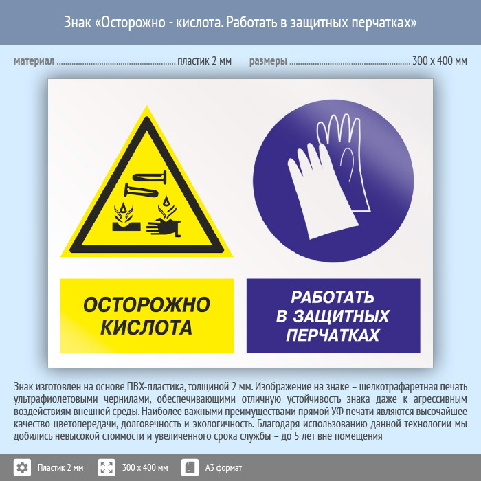 Знак «Осторожно - кислота. Работать в защитных перчатках», КЗ-56 (пластик, 400х300 мм) в Яхроме купить