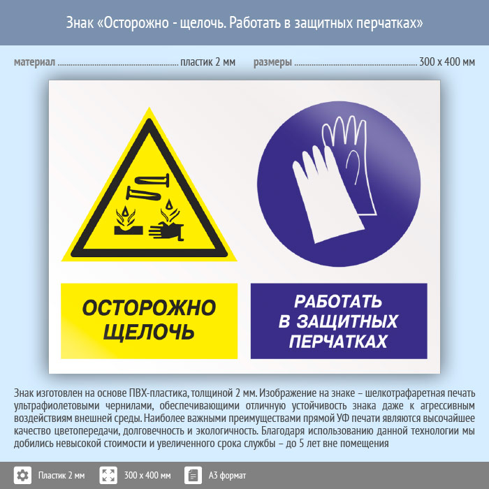 Знак «Осторожно - щелочь. Работать в защитных перчатках», КЗ-60 (пластик, 400х300 мм) в Яхроме купить