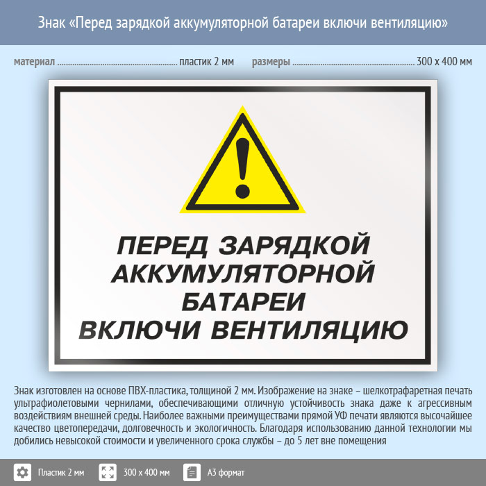 Знак «Перед зарядкой аккумуляторной батареи включи вентиляцию», КЗ-63 (пластик, 400х300 мм) в Яхроме купить