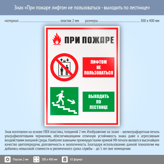 Знак «При пожаре лифтом не пользоваться - выходить по лестнице», КЗ-73 (пластик, 300х400 мм) в Яхроме купить