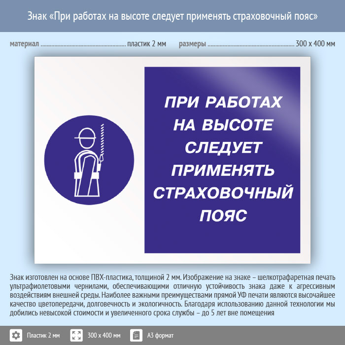 Знак «При работах на высоте следует применять страховочный пояс», КЗ-75 (пластик, 400х300 мм) в Яхроме купить