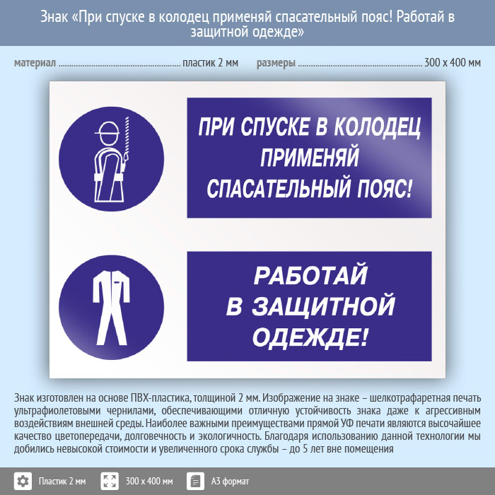 Знак «При спуске в колодец применяй спасательный пояс! Работай в защитной одежде», КЗ-76 (пластик, 400х300 мм) в Яхроме купить