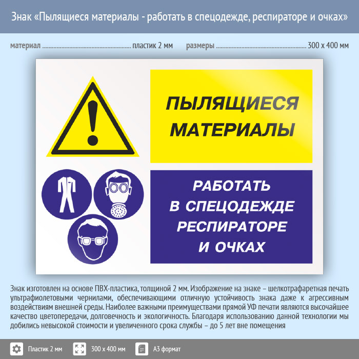 Знак «Пылящиеся материалы - работать в спецодежде, респираторе и очках», КЗ-79 (пластик, 400х300 мм) в Яхроме купить