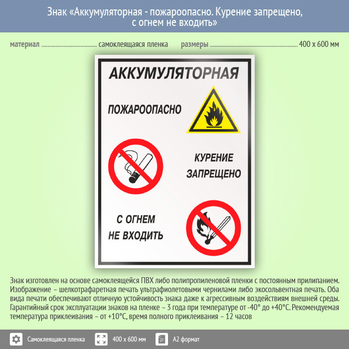 Знак «Аккумуляторная - пожароопасно. Курение запрещено, с огнем не входить», КЗ-01 (пленка, 400х600 мм) в Яхроме купить