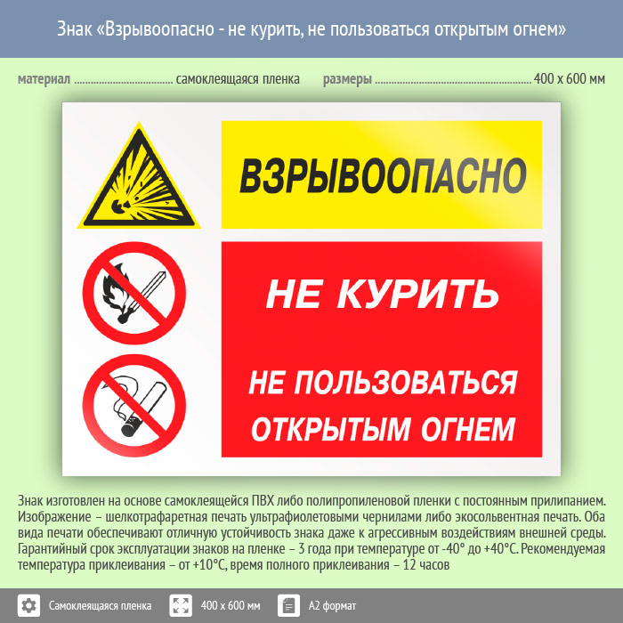 Знак «Взрывоопасно - не курить, не пользоваться открытым огнем», КЗ-05 (пленка, 600х400 мм) в Яхроме купить