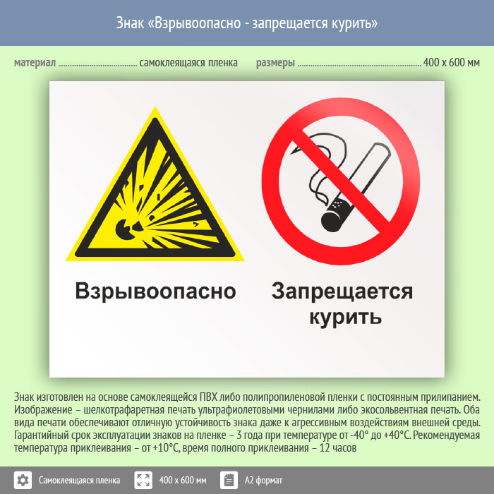 Знак «Взрывоопасно - запрещается курить», КЗ-06 (пленка, 600х400 мм) в Яхроме купить
