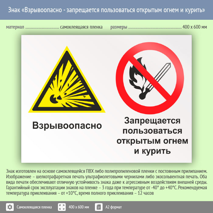 Знак «Взрывоопасно - запрещается пользоваться открытым огнем и курить», КЗ-07 (пленка, 600х400 мм) в Яхроме купить