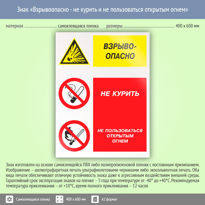 Знак «Взрывоопасно - не курить и не пользоваться открытым огнем», КЗ-08 (пленка, 400х600 мм) в Яхроме купить