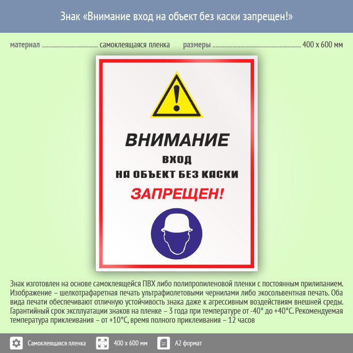 Знак «Внимание вход на объект без каски запрещен!», КЗ-13 (пленка, 400х600 мм) в Яхроме купить