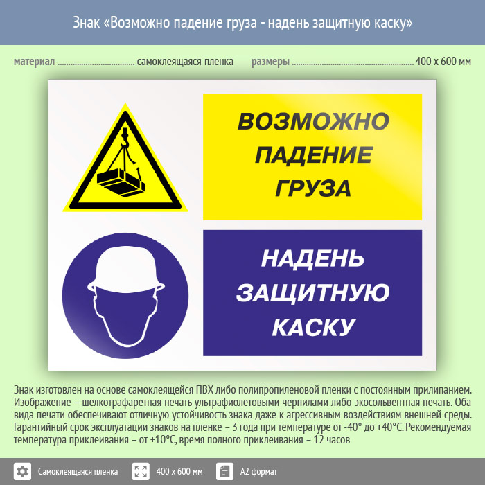 Знак «Возможно падение груза - надень защитную каску», КЗ-17 (пленка, 600х400 мм) в Яхроме купить