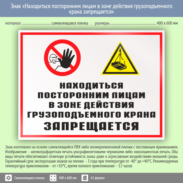 Знак «Находиться посторонним лицам в зоне действия грузоподъемного крана запрещается», КЗ-23 (пленка, 600х400 мм) в Яхроме купить