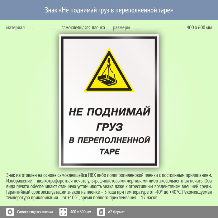 Знак «Не поднимай груз в переполненной таре», КЗ-26 (пленка, 400х600 мм) в Яхроме купить