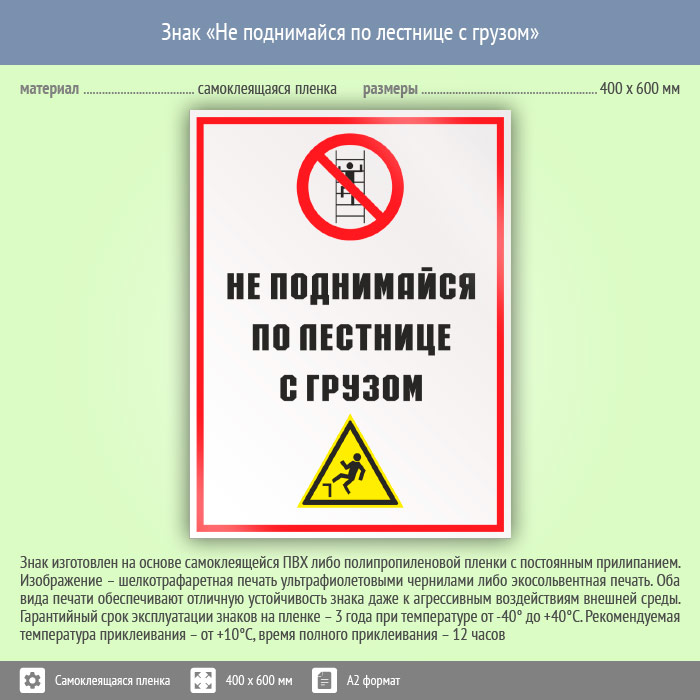 Знак «Не поднимайся по лестнице с грузом», КЗ-28 (пленка, 400х600 мм) в Яхроме купить