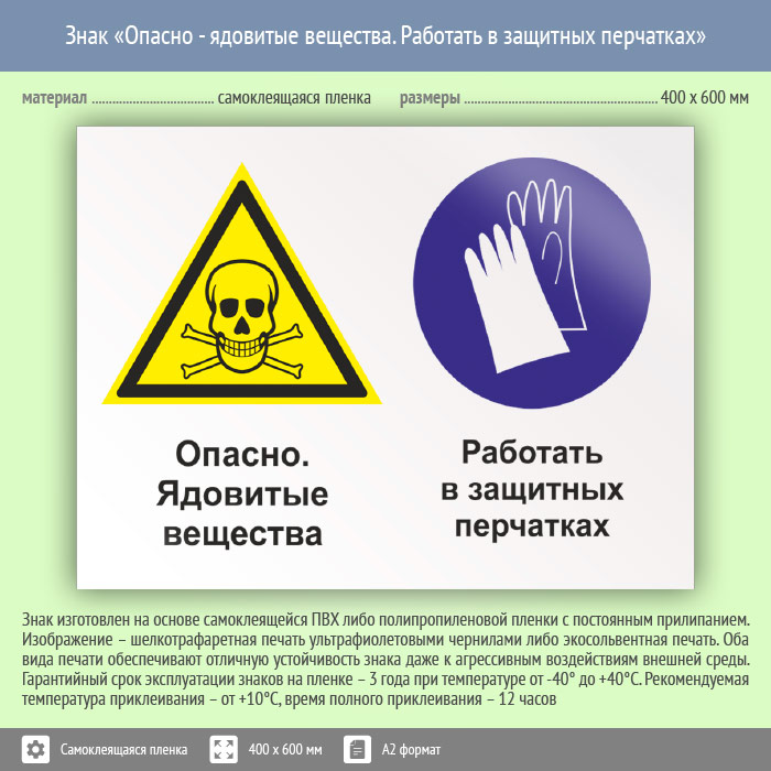 Знак «Опасно - ядовитые вещества. Работать в защитных перчатках», КЗ-43 (пленка, 600х400 мм) в Яхроме купить