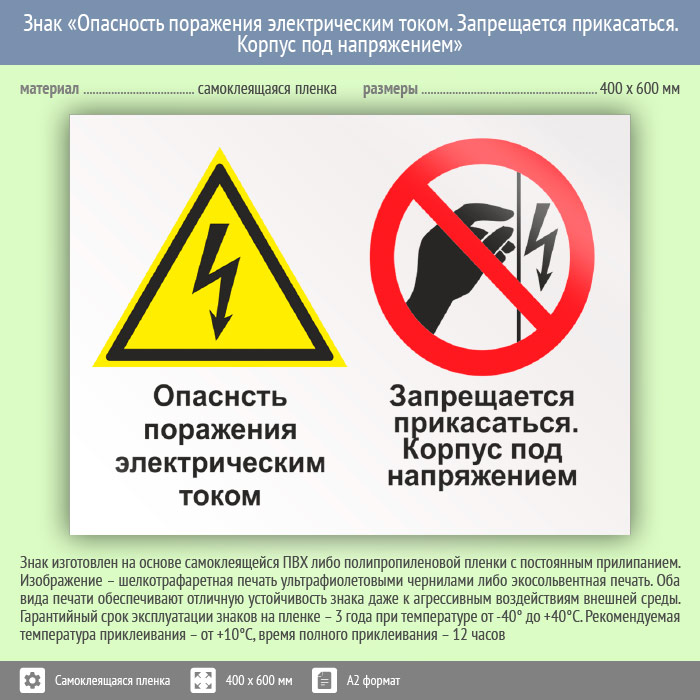 Знак «Опасность поражения электрическим током. Запрещается прикасаться. Корпус под напряжением», КЗ-47 (пленка, 600х400 мм) в Яхроме купить