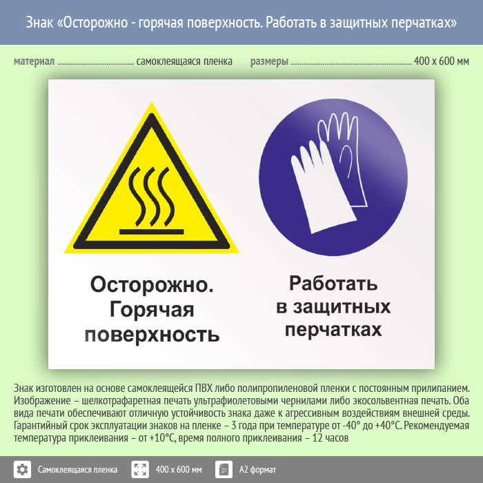 Знак «Осторожно - горячая поверхность. Работать в защитных перчатках», КЗ-55 (пленка, 600х400 мм) в Яхроме купить