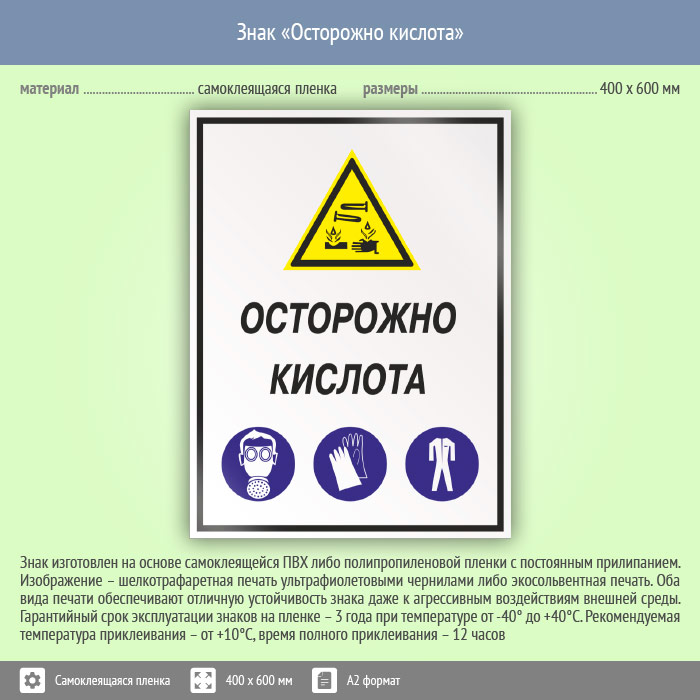 Знак «Осторожно кислота», КЗ-61 (пленка, 400х600 мм) в Яхроме купить