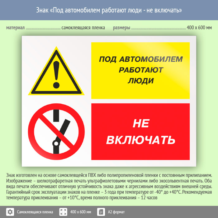 Знак «Под автомобилем работают люди - не включать», КЗ-65 (пленка, 600х400 мм) в Яхроме купить