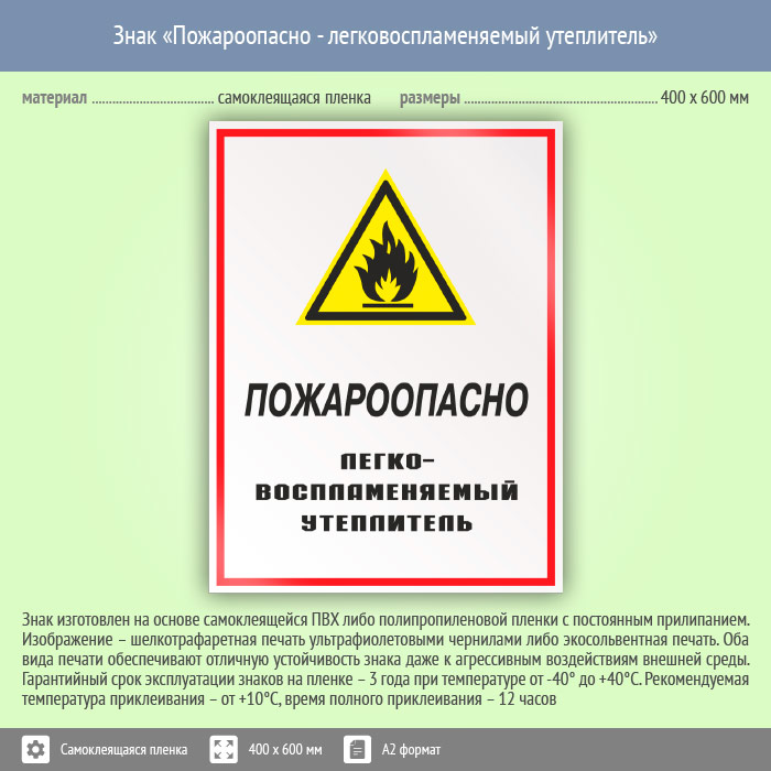 Знак «Пожароопасно - легковоспламеняемый утеплитель», КЗ-68 (пленка, 400х600 мм) в Яхроме купить