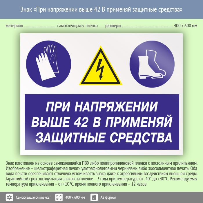 Знак «При напряжении выше 42 В применяй защитные средства», КЗ-72 (пленка, 600х400 мм) в Яхроме купить