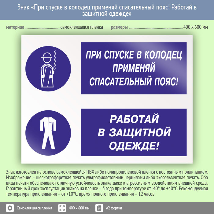Знак «При спуске в колодец применяй спасательный пояс! Работай в защитной одежде», КЗ-76 (пленка, 600х400 мм) в Яхроме купить
