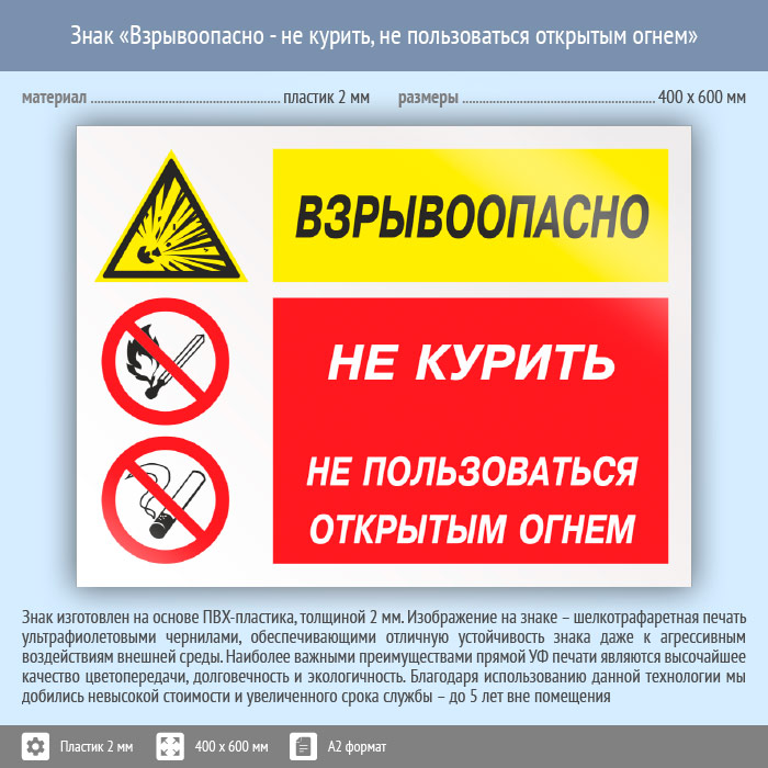 Знак «Взрывоопасно - не курить, не пользоваться открытым огнем», КЗ-05 (пластик, 600х400 мм) в Яхроме купить