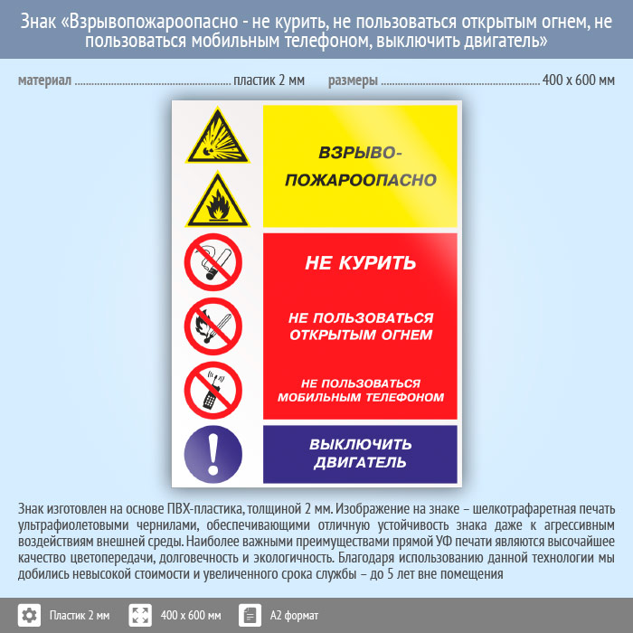 Знак «Взрывопожароопасно - не курить, не пользоваться открытым огнем, не пользоваться мобильным телефоном, выключить двигатель», КЗ-11 (пластик, 400х600 мм) в Яхроме купить