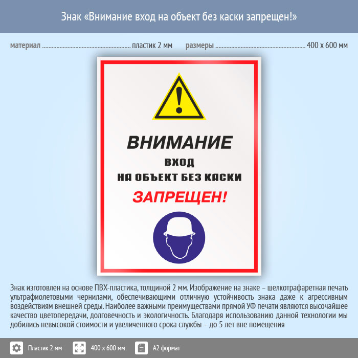 Знак «Внимание вход на объект без каски запрещен!», КЗ-13 (пластик, 400х600 мм) в Яхроме купить