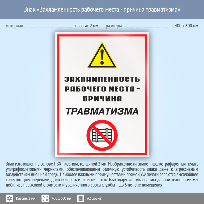 Знак «Захламленность рабочего места - причина травматизма», КЗ-21 (пластик, 400х600 мм) в Яхроме купить