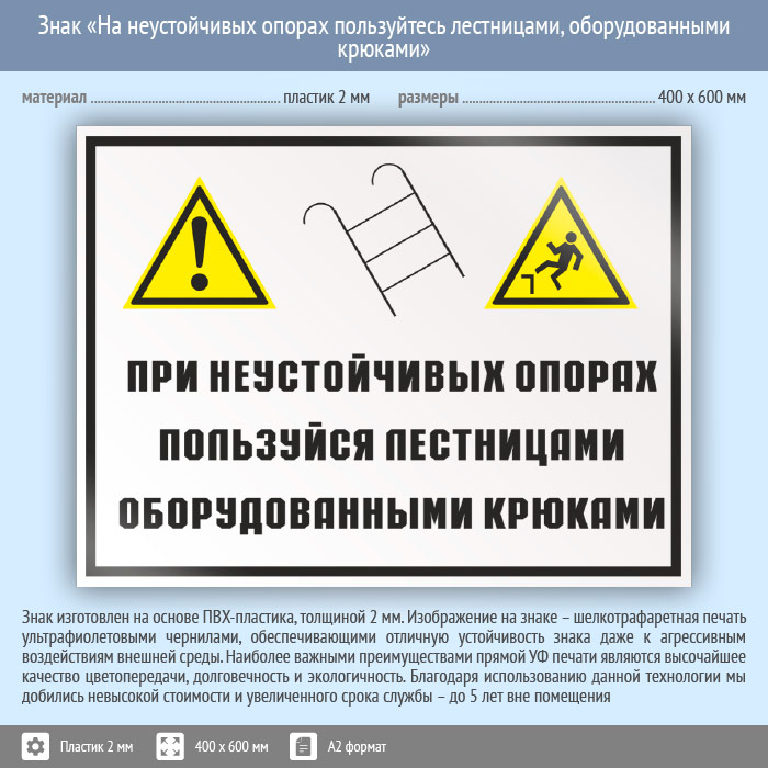 Знак «На неустойчивых опорах пользуйтесь лестницами, оборудованными крюками», КЗ-22 (пластик, 600х400 мм) в Яхроме купить