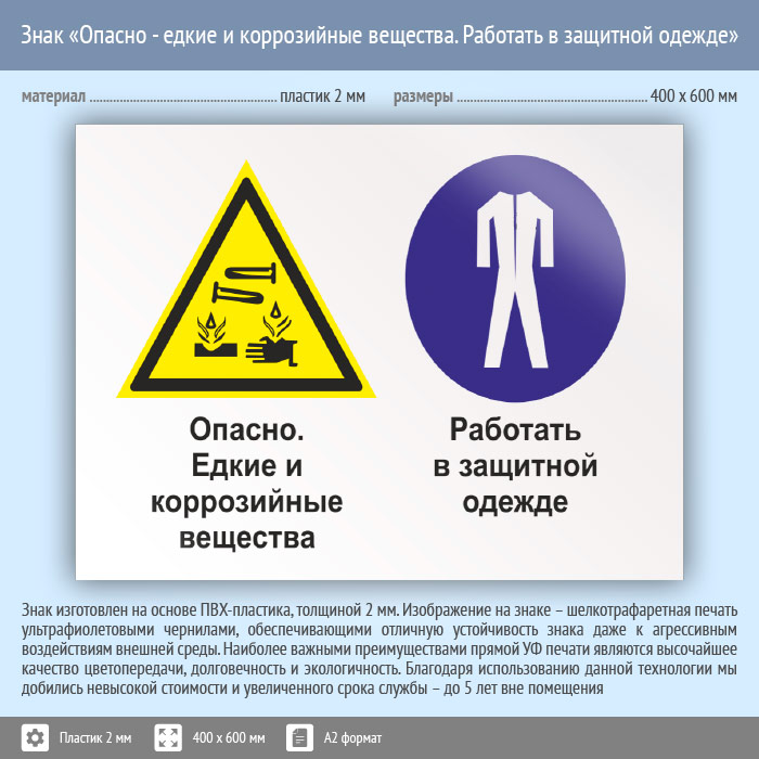 Знак «Опасно - едкие и коррозийные вещества. Работать в защитной одежде», КЗ-35 (пластик, 600х400 мм) в Яхроме купить