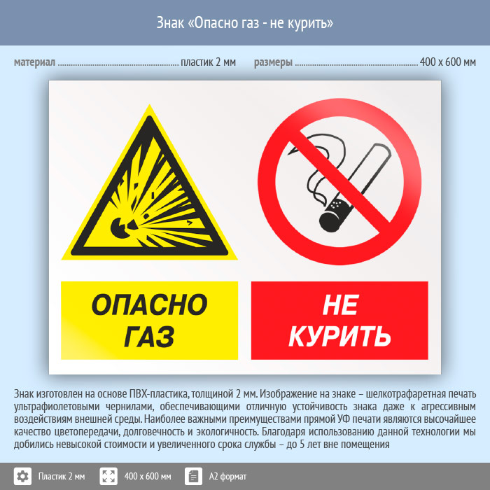 Знак «Опасно газ - не курить», КЗ-44 (пластик, 600х400 мм) в Яхроме купить