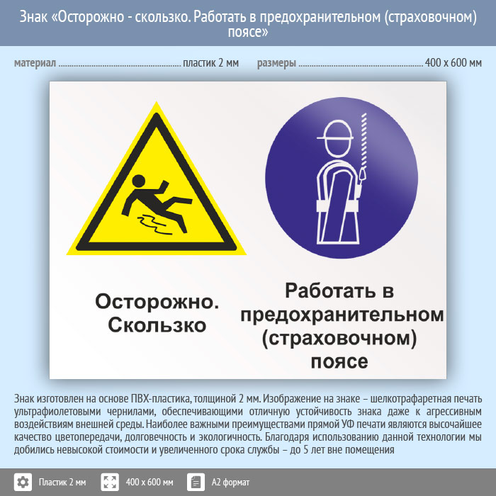 Знак «Осторожно - скользко. Работать в предохранительном (страховочном) поясе», КЗ-58 (пластик, 600х400 мм) в Яхроме купить