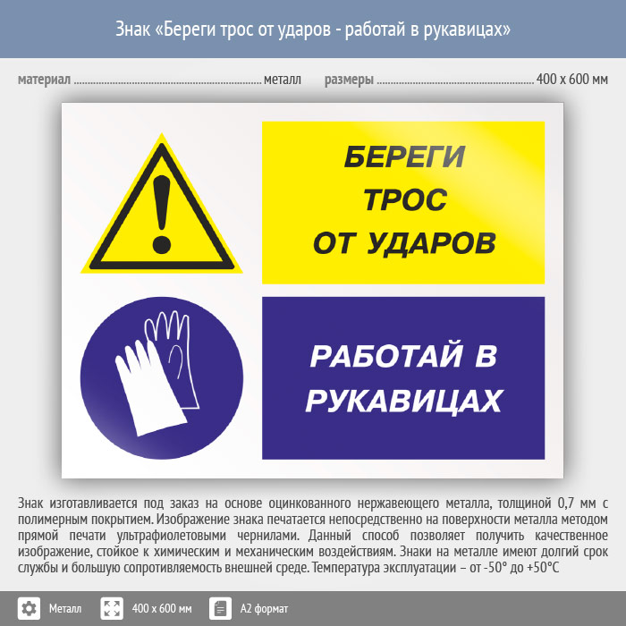 Знак «Береги трос от ударов - работай в рукавицах», КЗ-03 (металл, 600х400 мм) в Яхроме купить
