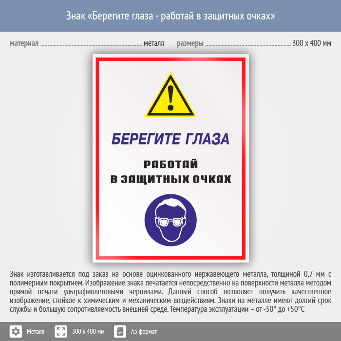 Знак «Берегите глаза - работай в защитных очках», КЗ-04 (металл, 300х400 мм) в Яхроме купить
